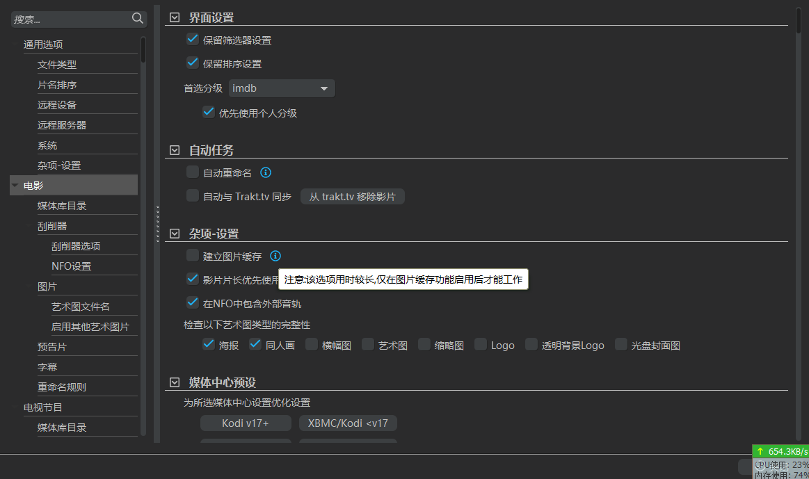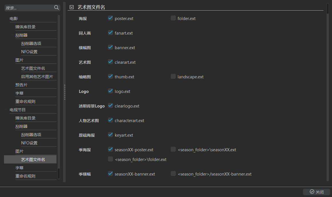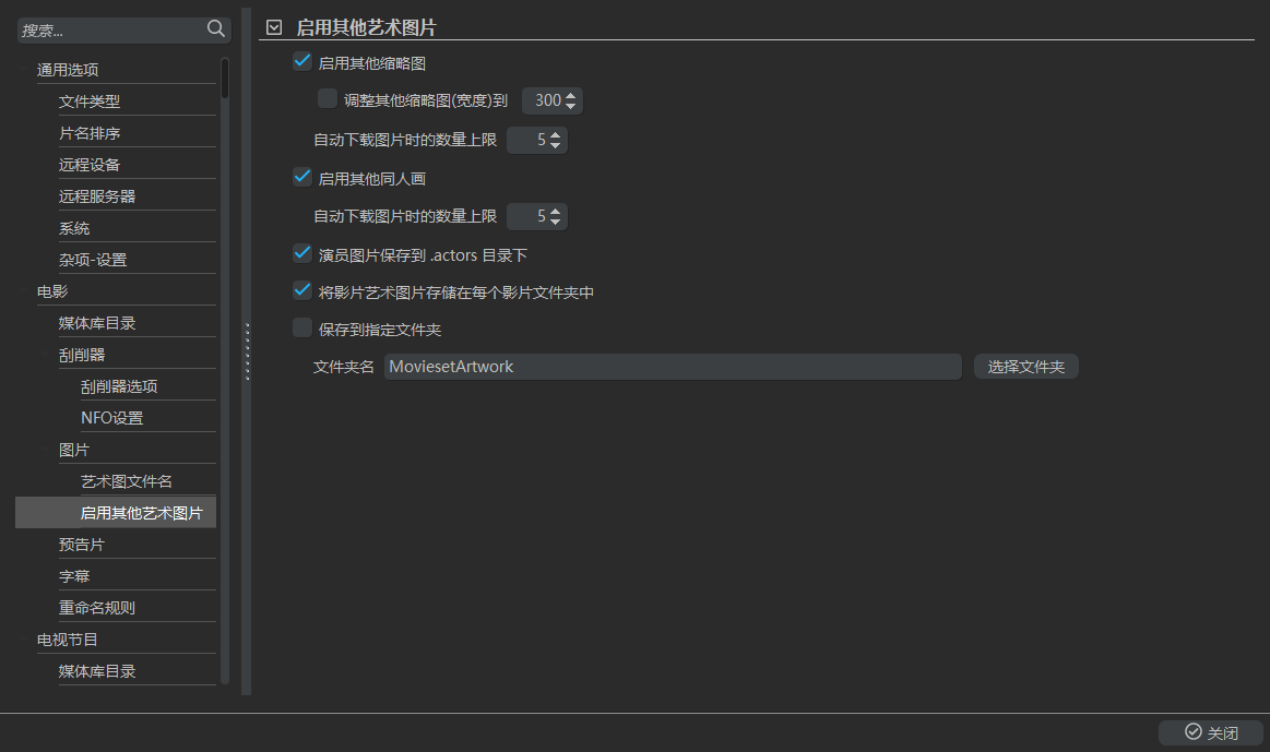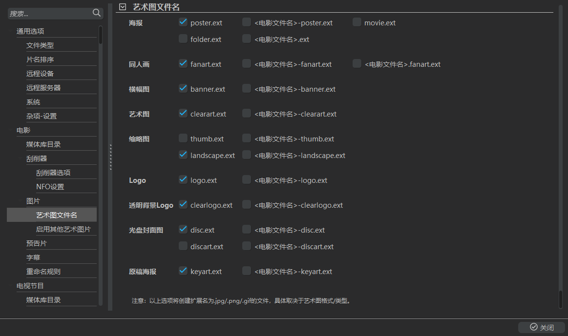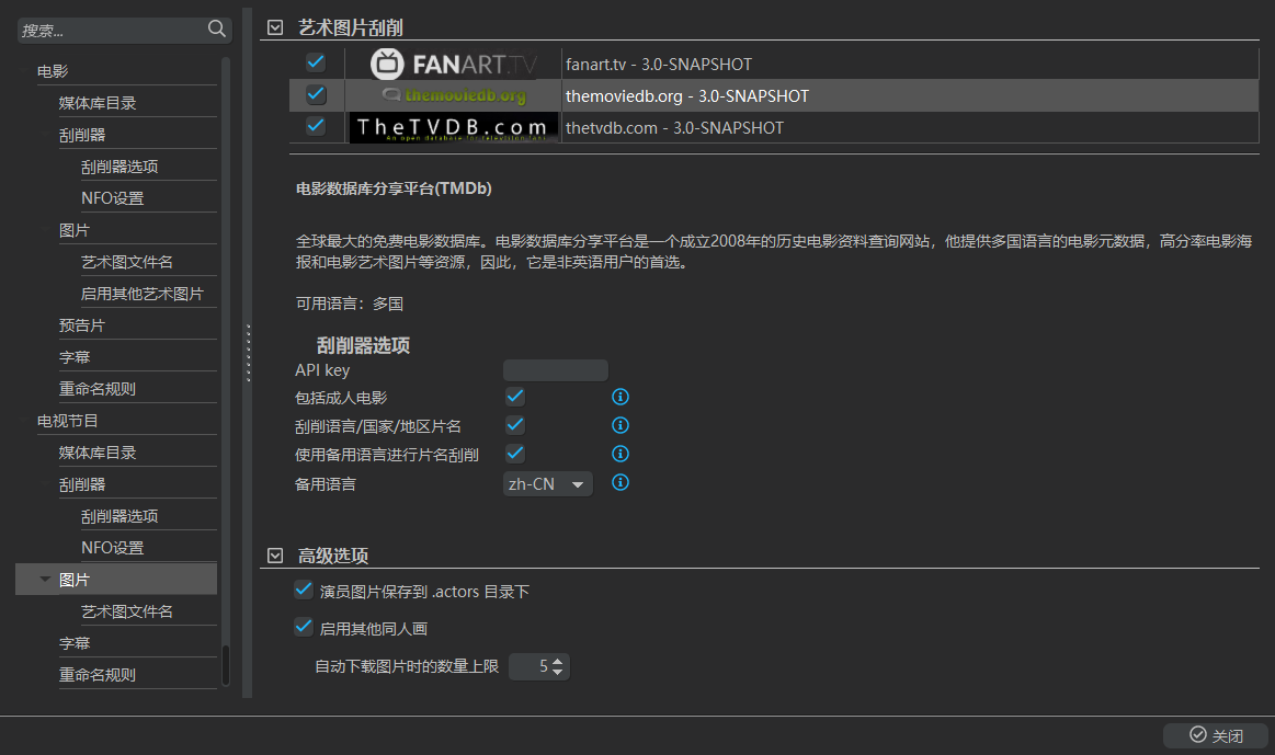 可以从TheMovieDB.org和Fanart.tv下载诸如,同人画,封面海报,艺术图片,光盘封面,logos等艺术图片。