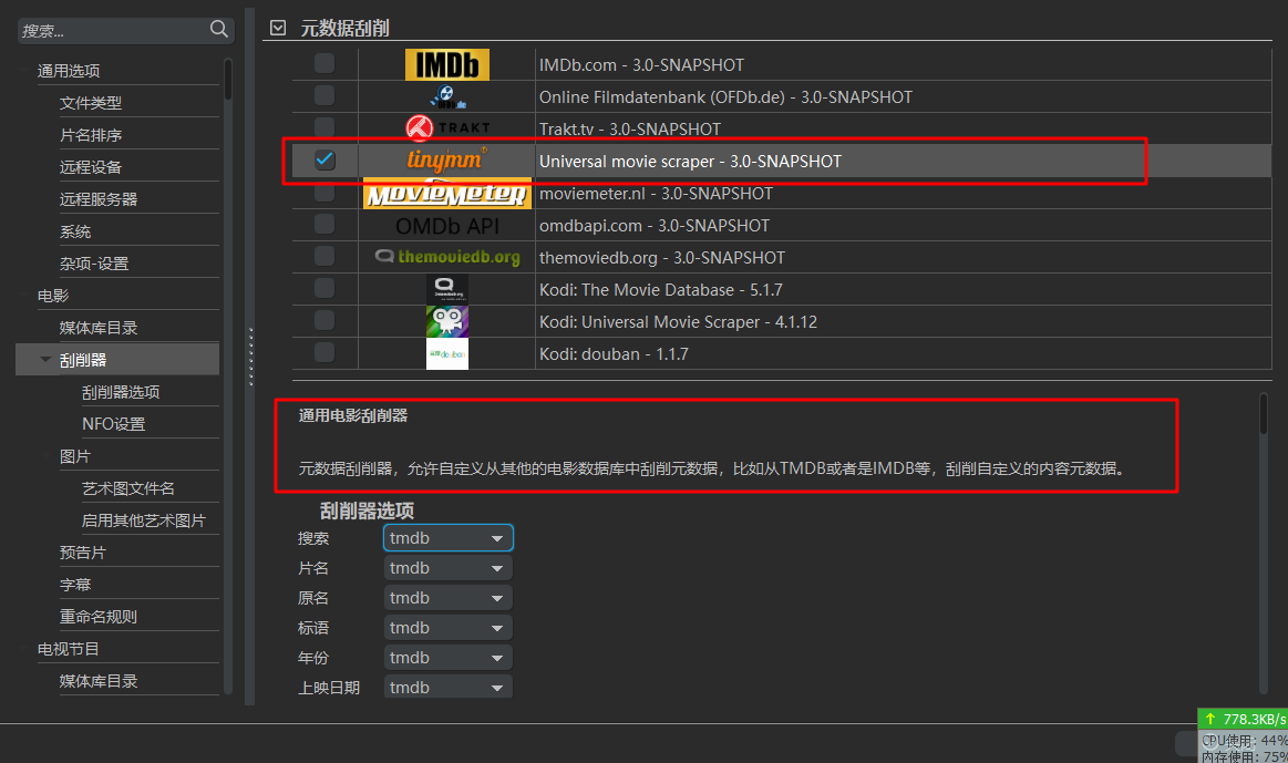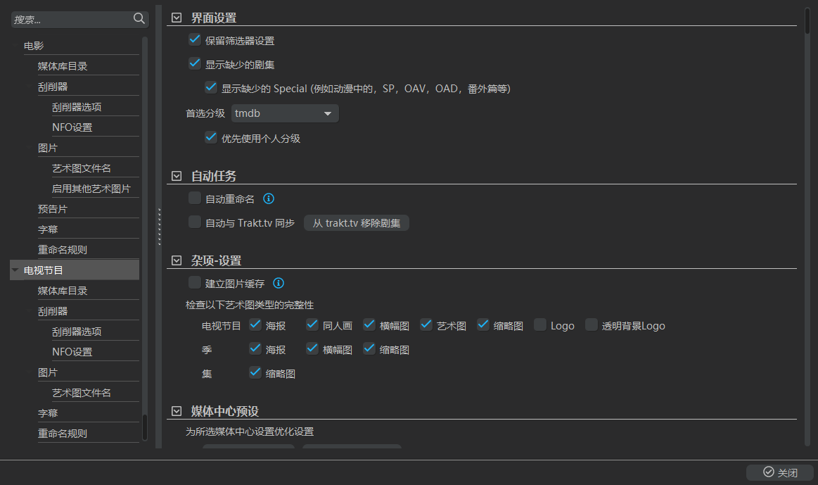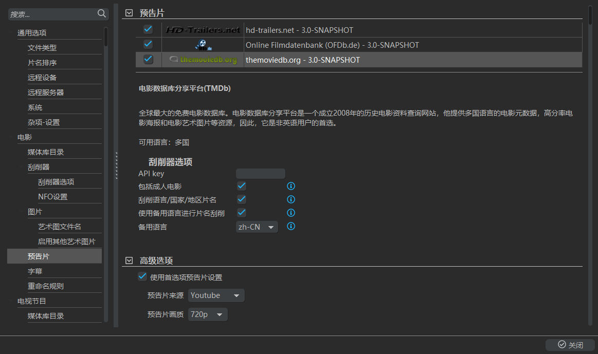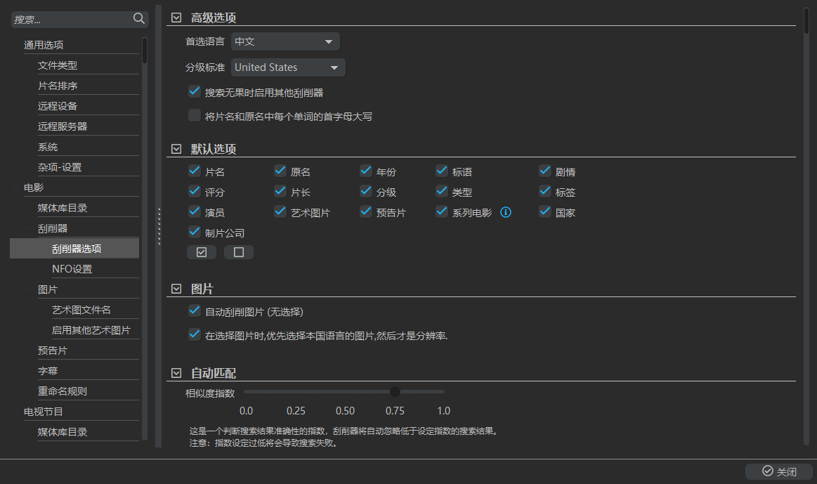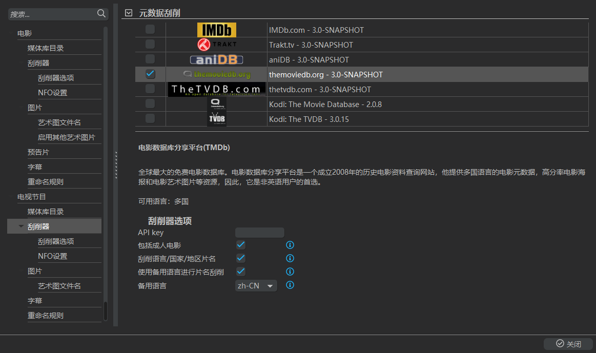 这里我们选择TMM自带的刮削器,可以自定义每一个选项的元数据来源网站。其他的不需要选,我也不想解释了,里面都有中文介绍。