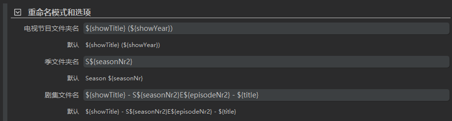季文件夹名:S${seasonNr2},这里就是S是季名称的简写,默认是 season ,但是为了更简单的设置,我们不需要 season ,直接写成S即可, ${seasonNr2} Nr2 就是有两位数的数字结构,也就是比如第一季的文件夹名称就是S01,如果设置成 ${seasonNr} ,那么季文件夹名称就是S1,也就单位数,所以 S${seasonNr2} 这段组合,重命名后就是S01,S02这种以此类推,