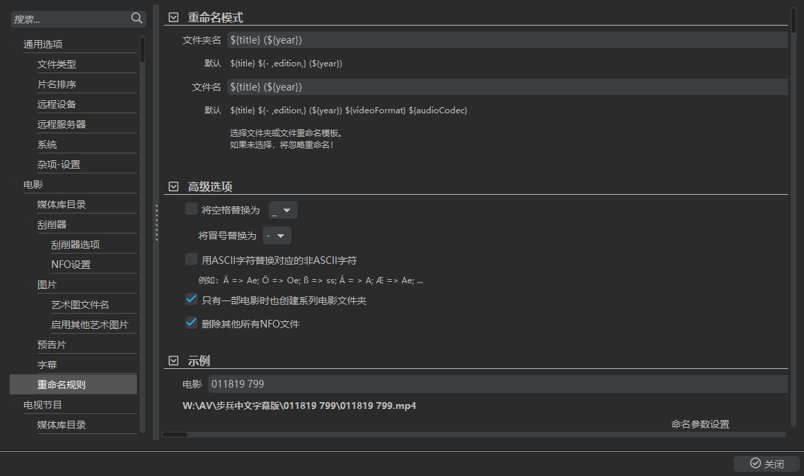 重命名设置,详情的请去看我的EMBY重命名规则设置,和目录结构等,TMM这里最好是也按照EMBY的重命名参数进行设置,这里我们把文件夹名和文件名参数设置都改成:${title} (${year}),也就是电影文件名+年份,下面都会给出命名参数和更改后的预览等,一会儿电视节目设置里面我讲一下,因为那个部分全,涉及到剧集等的改名。