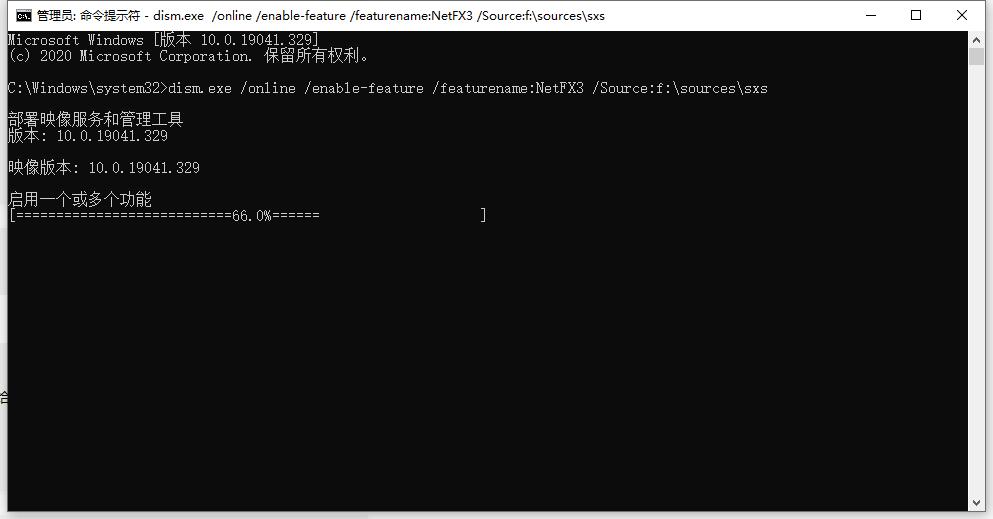 四、输入dism.exe /online /enable-feature /featurename:NetFX3 /Source:f\sources\sxs 回车(不要全部照抄,红字要改成第二步实际加载的盘符,我这是F盘);