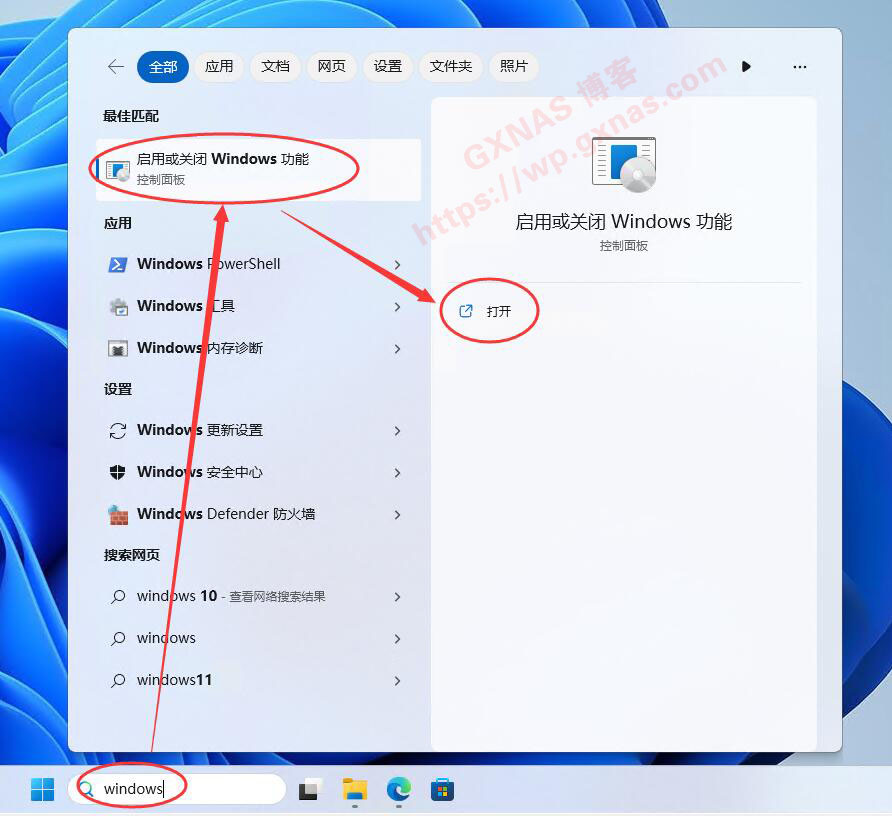 6、启动完成后,稍为设置一下就进入到Windows的桌面了,在屏幕下方中间的搜索栏输入“windows”,找到“启用或关闭Windows功能”,打开;
