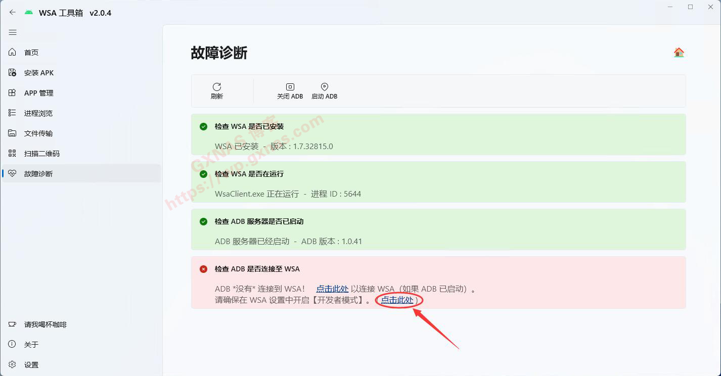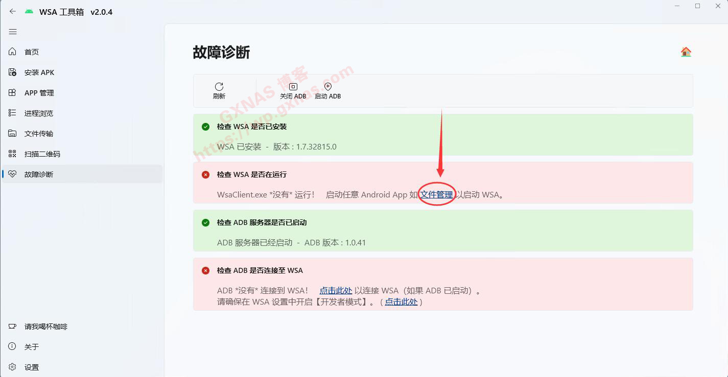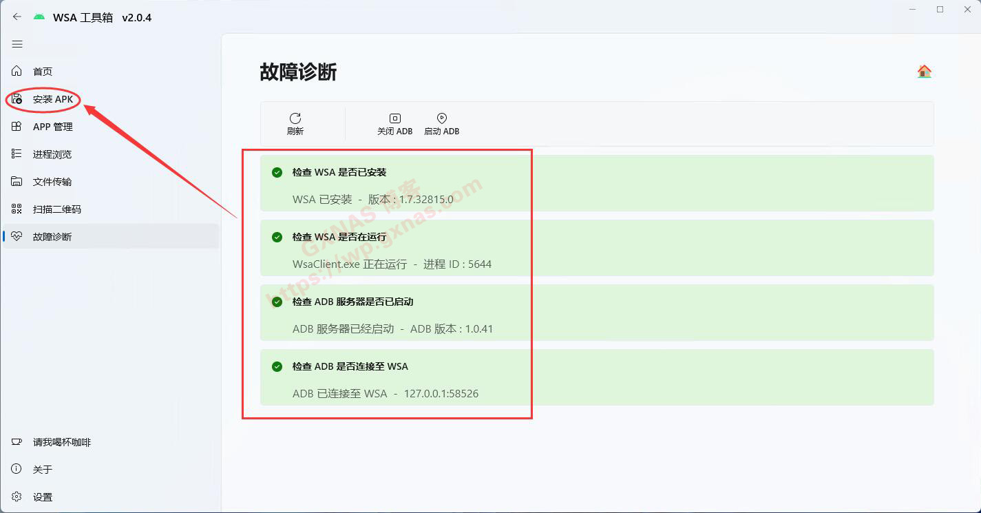 32、当看到故障诊断这个页面全部为绿了,就表示安卓子系统已经正常运行了,点“安装APK”,下一步要安装APP了;