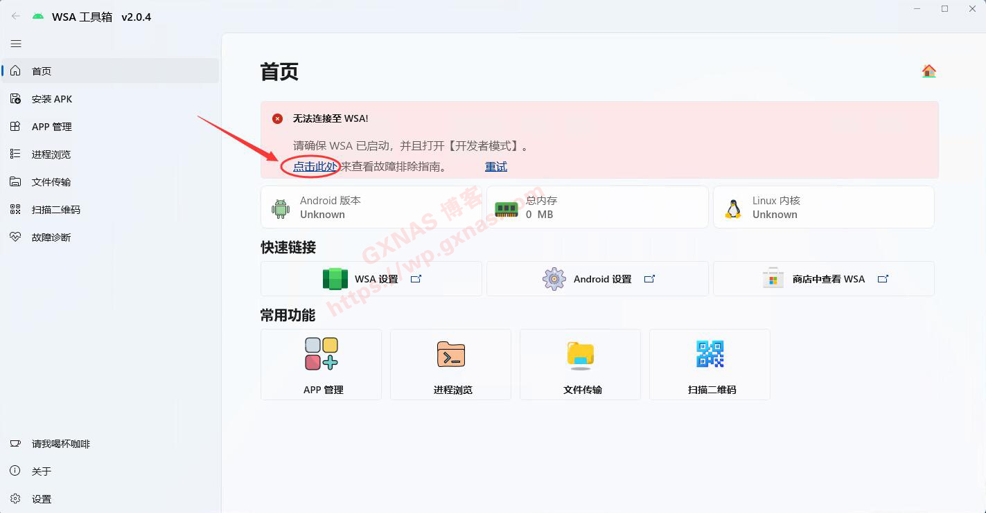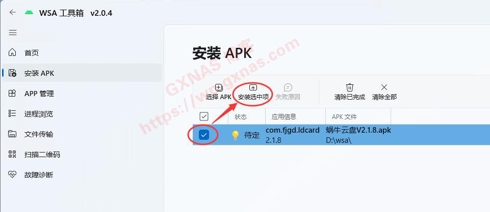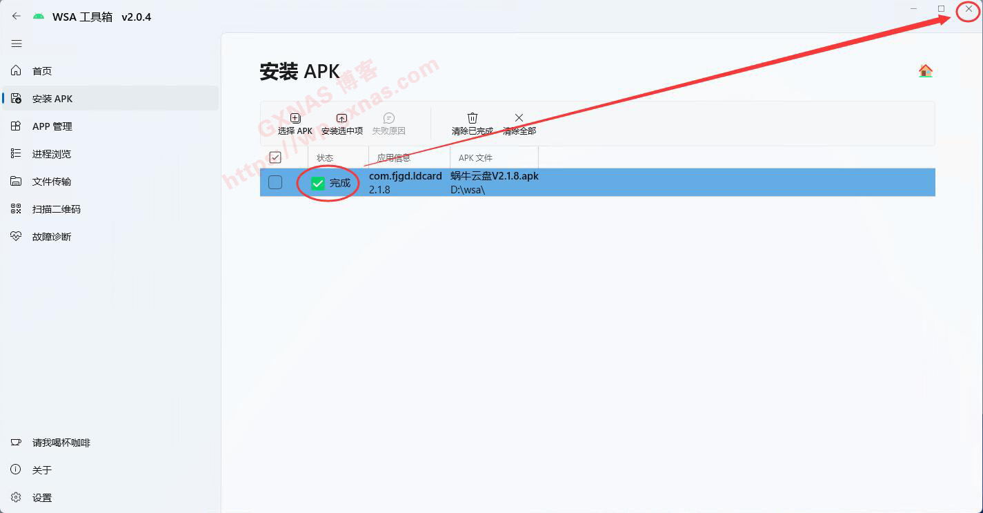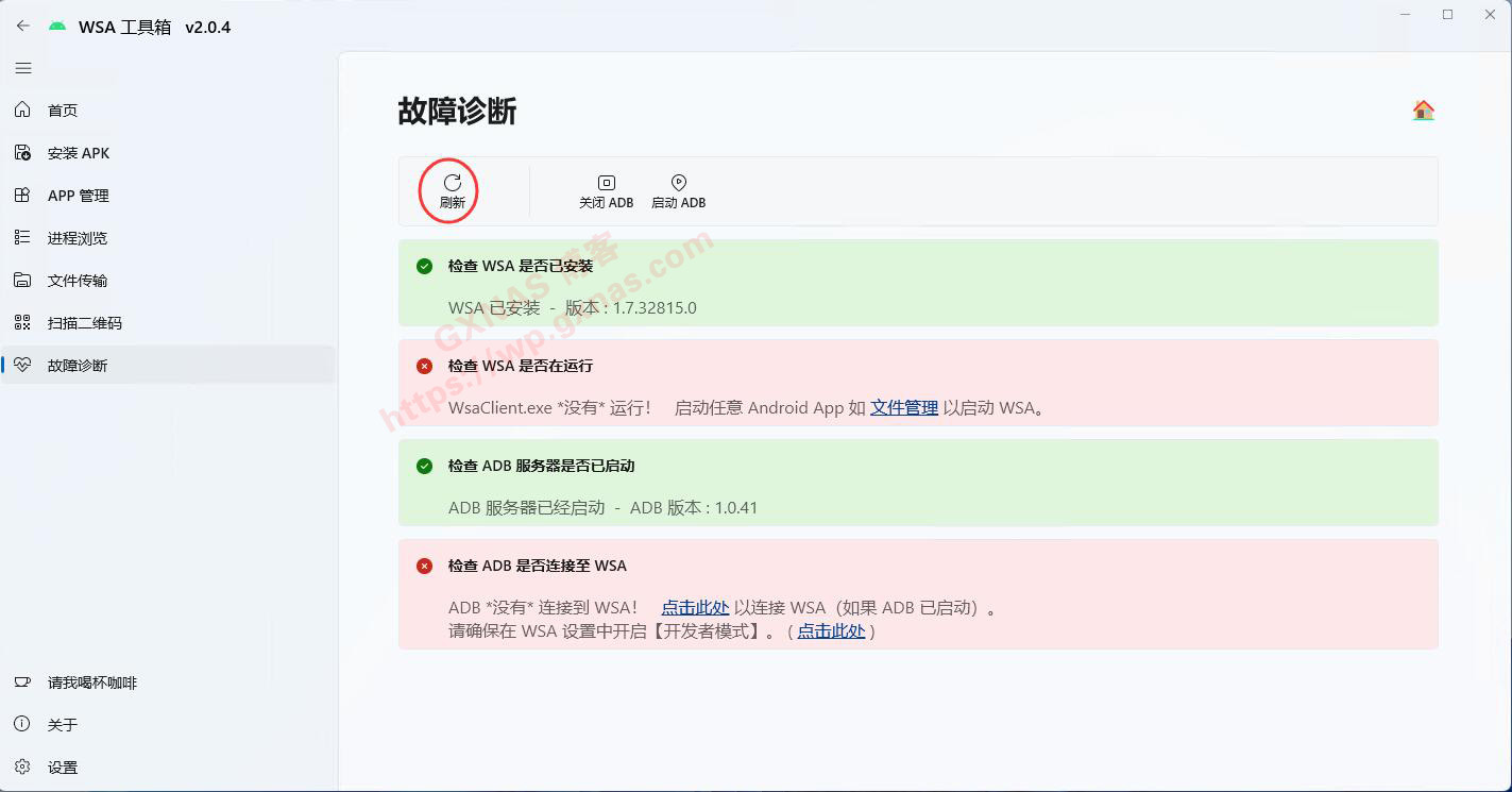32、当看到故障诊断这个页面全部为绿了,就表示安卓子系统已经正常运行了,点“安装APK”,下一步要安装APP了;