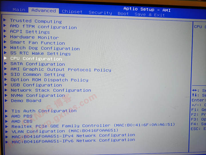 2、此时会进入到BIOS设置界面,进入“Advanced”页面,找到“CPU Configuration”设置选项,按回车键;