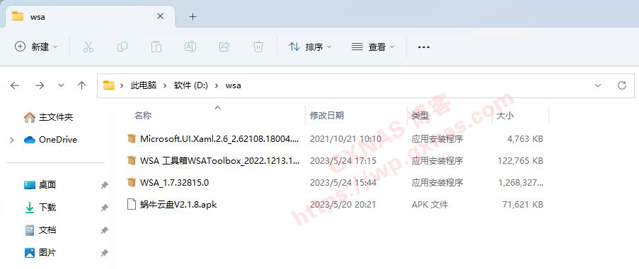 11、把“WSA-2303.40000.3.0.zip”这个压缩包解压出来,然后删除“WSA-2303.40000.3.0.zip”,留下Microsoft.UI.Xaml.2.6_2.62108.18004.0_x64__8wekyb3d8bbwe.Appx、WSA 工具箱WSAToolbox_2022.1213.1541.0.Msixbundle、WSA_1.7.32815.0.Msixbundle、蜗牛云盘V2.1.8.apk这四个文件;