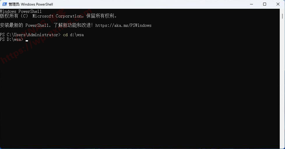 13、在黑色框里面输入以下命令回车,进入到D盘的wsa文件夹下(如果你在第12步骤操作的文件夹不是在D盘wsa,请自行把命令中的d:\wsa更改为你的实际路径);