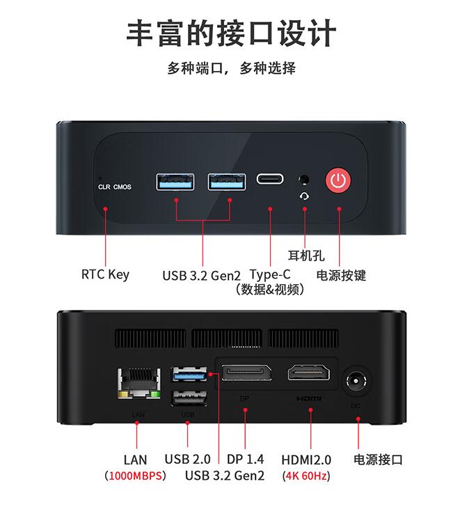主机前面板上有两个USB3.2高速接口(方便连接移动硬盘用来扩展磁盘空间),有一个Type-C接口(方便连接手机或者其他设备),还有一个3.5mm音频接口。在机身背面,有一个千兆有线网口、一个USB3.2接口和一个USB2.0接口(用来连接键盘鼠标,强烈建议客厅使用无线键鼠)、一个DP1.4和一个HDMI 2.0高清显示输出口(可用来同时接上液晶电视和显示器做多屏输出)。