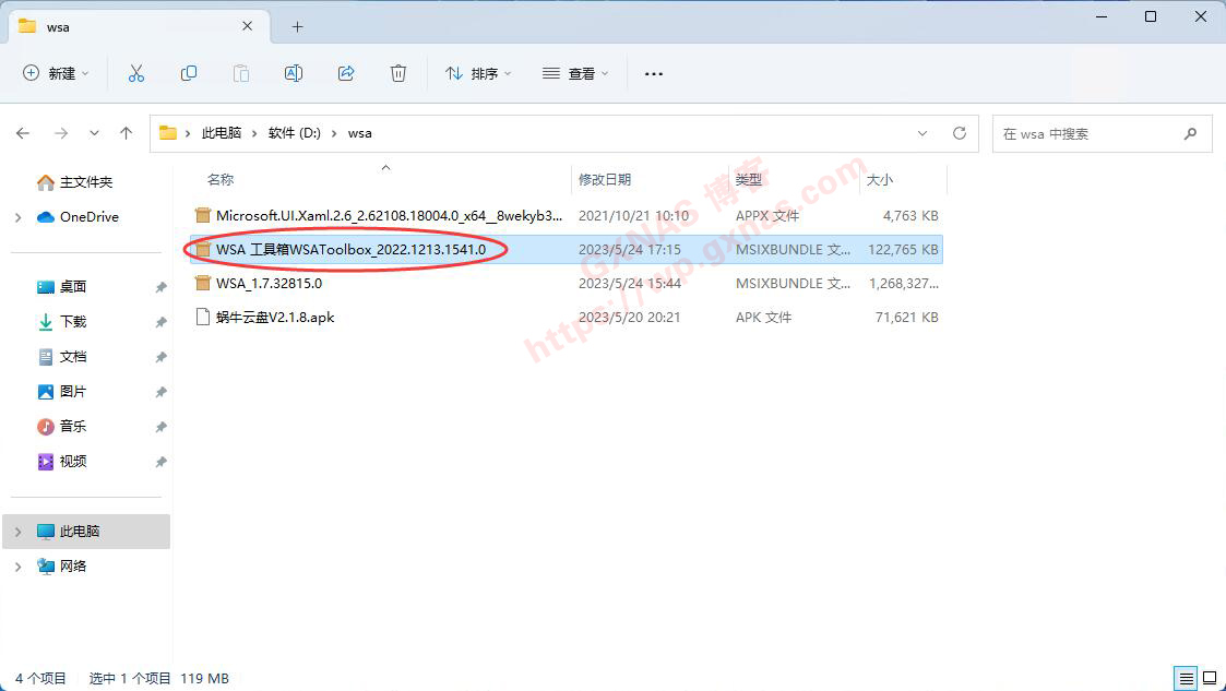 19、在D盘的wsa文件夹下找到WSA 工具箱WSAToolbox_2022.1213.1541.0.Msixbundle,双击运行;