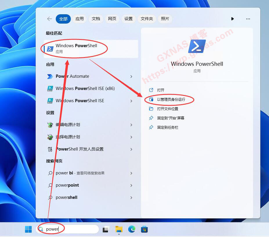 12、在屏幕下方中间的搜索栏输入“power”,找到“以管理员身份运行”,点一下;