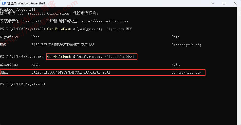Get-FileHash d:\nas\grub.cfg -Algorithm SHA1