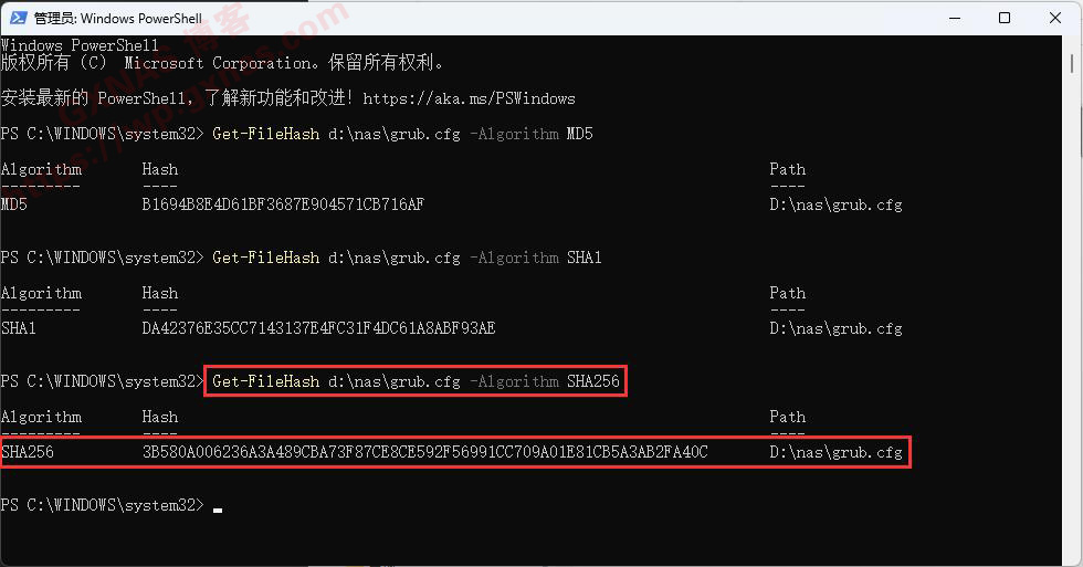 Get-FileHash d:\nas\grub.cfg -Algorithm SHA256