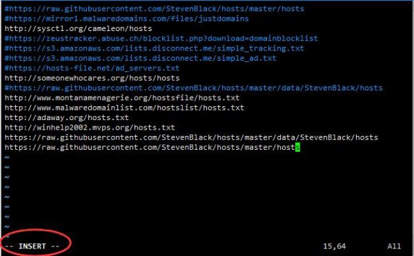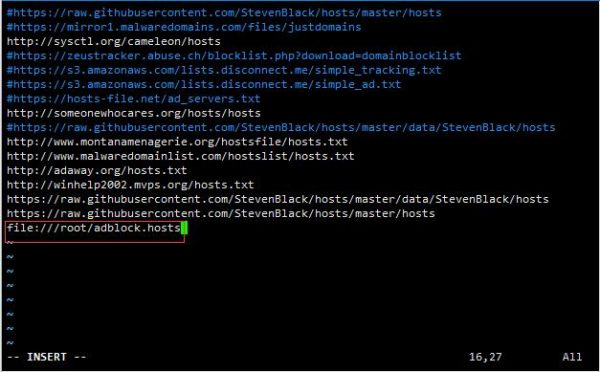 68、移动向下键到文件最后一行按回车新起一行,输入“file:///root/adblock.hosts”