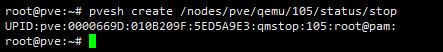 pvesh create /nodes/PVE节点名称/qemu/虚拟机的id/status/stop