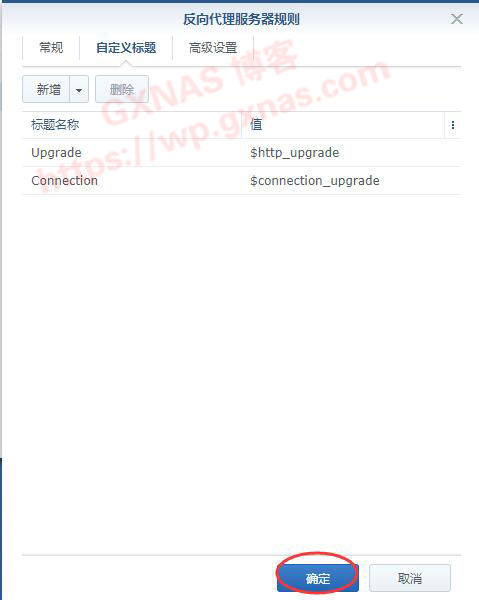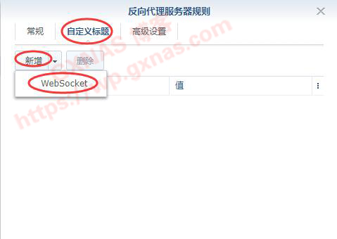 如果你的群晖DSM版本是6.21-23824版本或者高于6.21-23824版本的,只需要在建立反向代理的时候,在“自定义标题”—“新增”,点选“WebSocket”;
