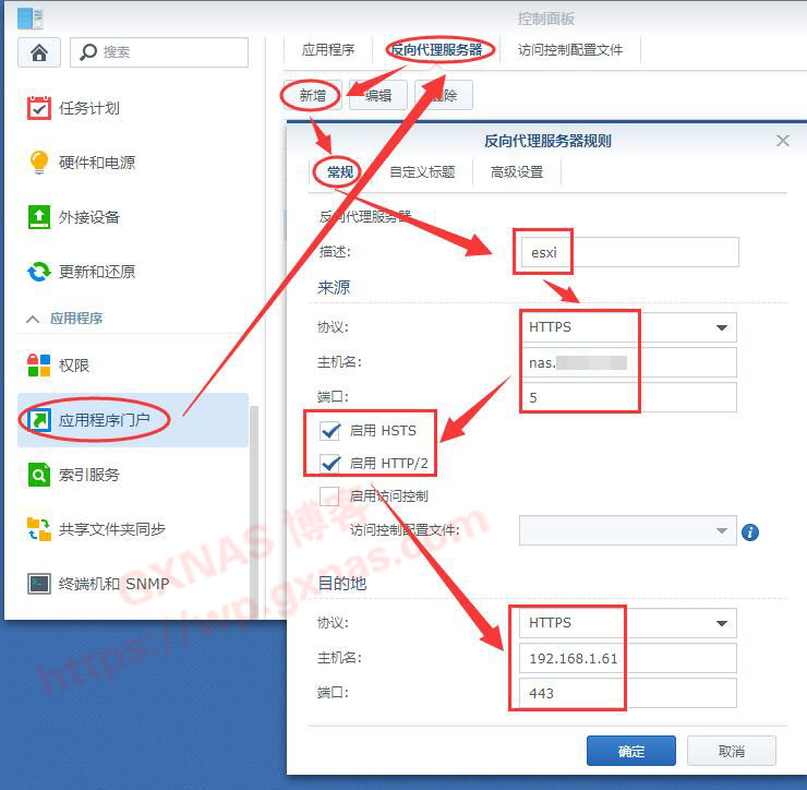 正常情况下,在群晖的控制面板-应用程序门户-反向代理服务器,新增,来源设置成我们想要访问的外网域名和端口,目的地是ESXI内网的IP和端口;