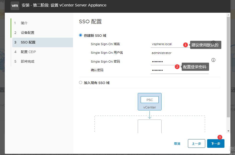 创建SSO域,建议使用默认的vsphere.local