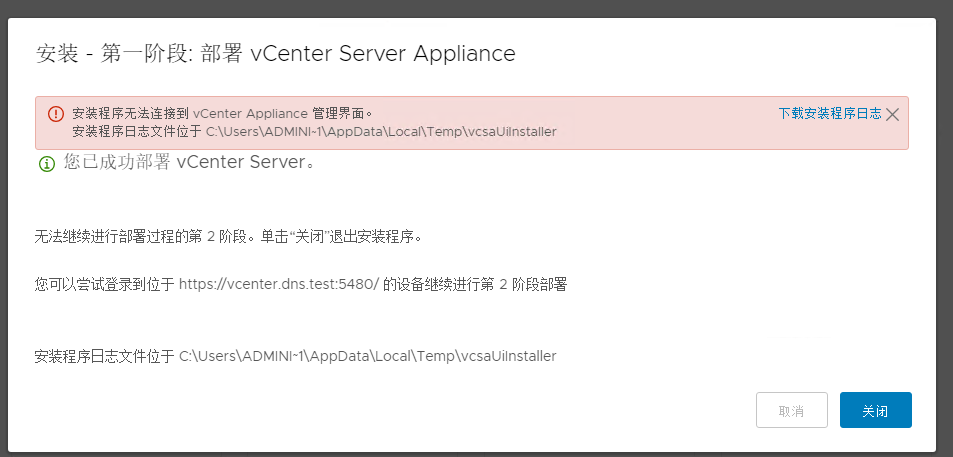出现了报错,不过没关系,先下载安装程序日志,看一下,也可以去 5480进行部署
