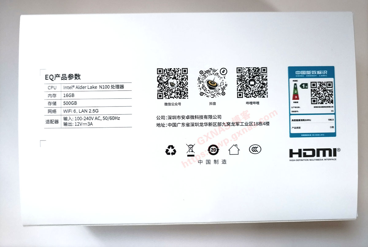 3、再来个背面照,上面写有CPU型号为N100,内存16GB,硬盘为500GB,以及一级能效的标识,说明这台机器非常省电。)