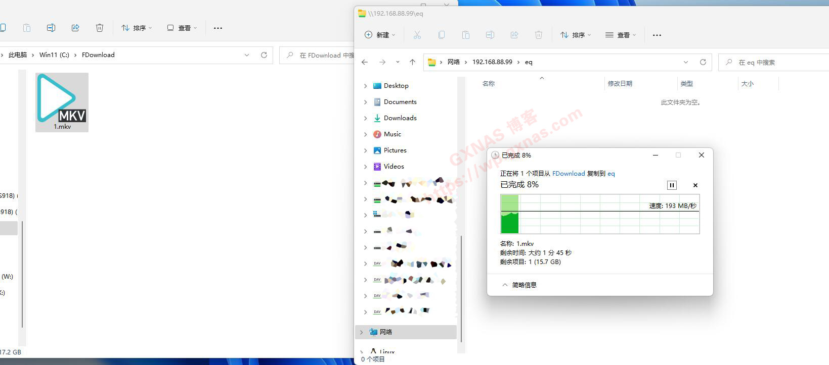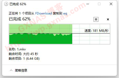 1、下图为从我的破电脑复制文件到小主机的速度,初始速率193MB/s;