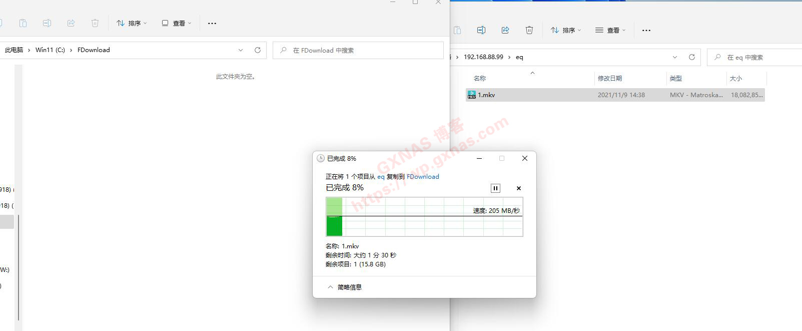4、下图是从小主机复制到我电脑的速度,能上到205MB/s,看来是我破电脑的硬盘拖累了,理论上应该还能再快一点;