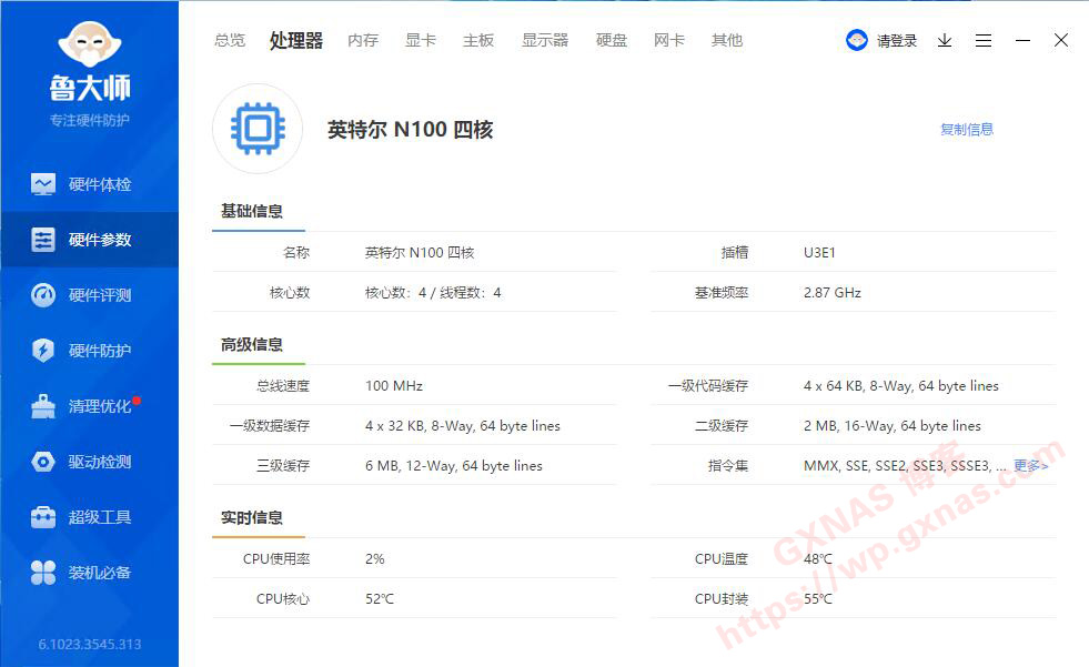 2、CPU是12代最新的型号N100,四核心四线程,三级缓存6MB,目前运行频率为2.87GHz为基准频率,没有开启睿频;)
