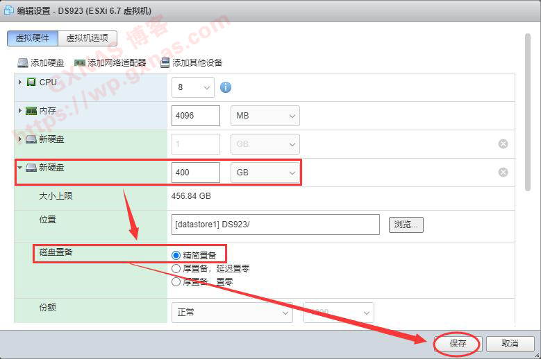 24、根据实际需要设置虚拟机硬盘的大小,我这里分配400GB,硬盘置备设置为精简置备,保存;