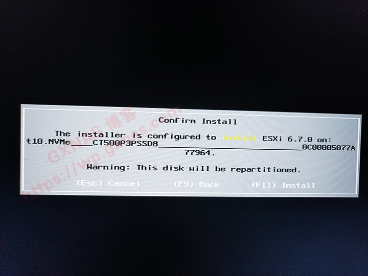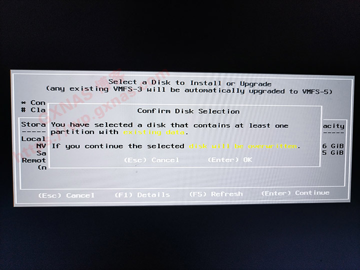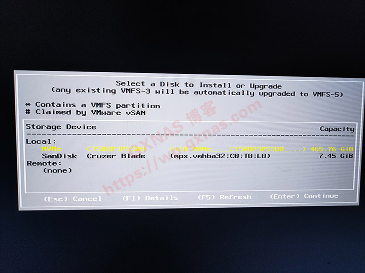 14、我要把ESXI安装到零刻SEi10 1035G7主机内置的NVME硬盘上,所以选择在这个NVME硬盘,按下回车键继续;