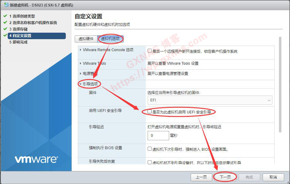 16、在虚拟机选项里面,把引导选项里面的“启用UEFI安全引导”这个打勾去掉,下一页;