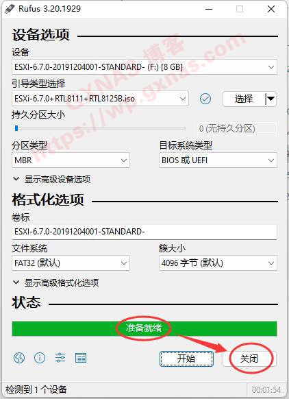 5、耐心等待一会,刷写结束后“状态”会显示“准备就绪”,点“关闭”退出写盘软件;