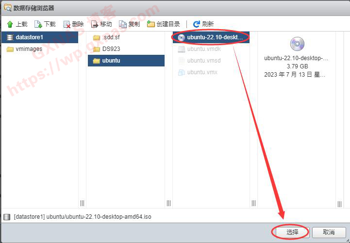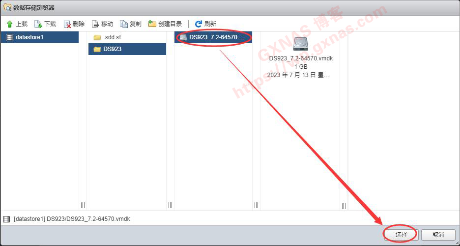 22、当DS923_7.2-64570.vmdk和DS923_7.2-64570-flat.vmdk两个文件都上传完成后,这里就会显示出DS923_7.2-64570.vmdk(此时DS923_7.2-64570-flat.vmdk会自动处于隐藏状态,属于正常现象),点DS923_7.2-64570.vmdk这个文件,再点“选择”;