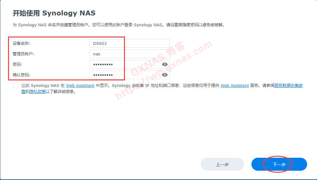 37、根据实际需要设置设备名称(必须以英文字母开头)、管理员账号(可以使用中文)、管理员密码(要求:大写字母+小写字母+数字的组合,长度8位或以上),下一步;
