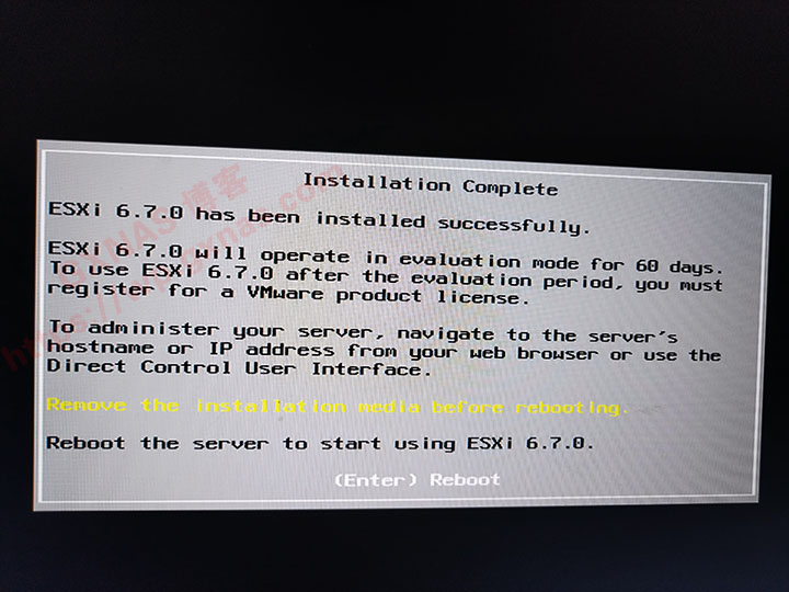 20、显示到这个界面就表示ESXI安装结束了,此时需要把U盘拨出来,然后按下回车键,主机随后会自动重启;