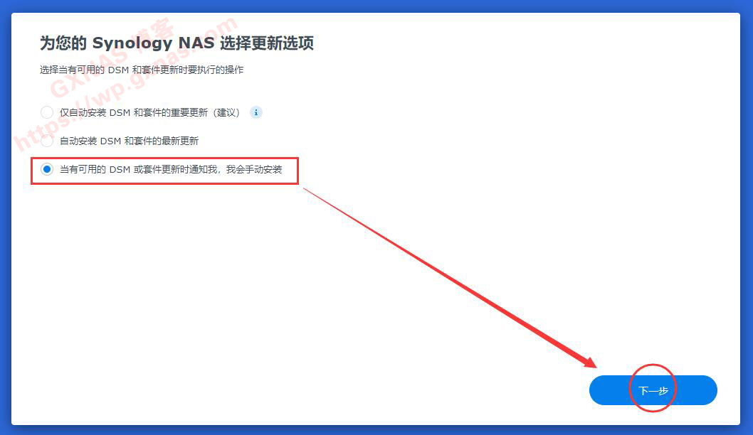 38、选择“当有可用的DSM或套件更新时通知我,我会手动安装”,下一步;