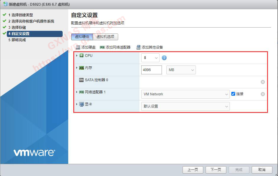 15、我把虚拟机的配置调整到8个核心,4G内存,并且把多余的SCSI控制器、USB控制器、CD/DVD驱动器删除,只留下CPU、内存、SATA控制器,网络适配器、显卡;
