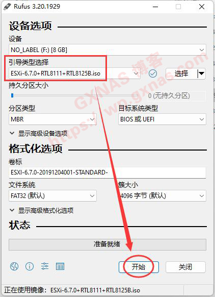 3、确认一下“引导类型选择”显示的是ESXI的安装镜像文件,其他不需要设置,直接点“开始”;