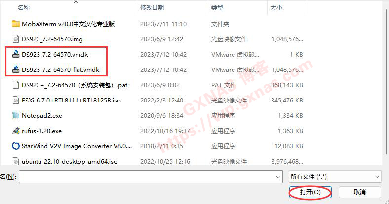 21、找到DS923_7.2-64570.vmdk和DS923_7.2-64570-flat.vmdk,每次选择一个文件打开一个文件,重复上一个步骤分两次上载到DS923文件夹