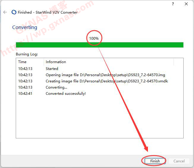 9、当看到100%的时候,表示转换完成,点“Finish”;