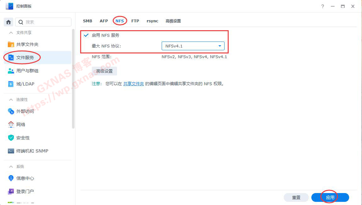56、打开群晖控制面板,文件服务,NFS,在“启用NFS服务”处打勾,最大NFS协议选择“NFSv4.1”,应用;