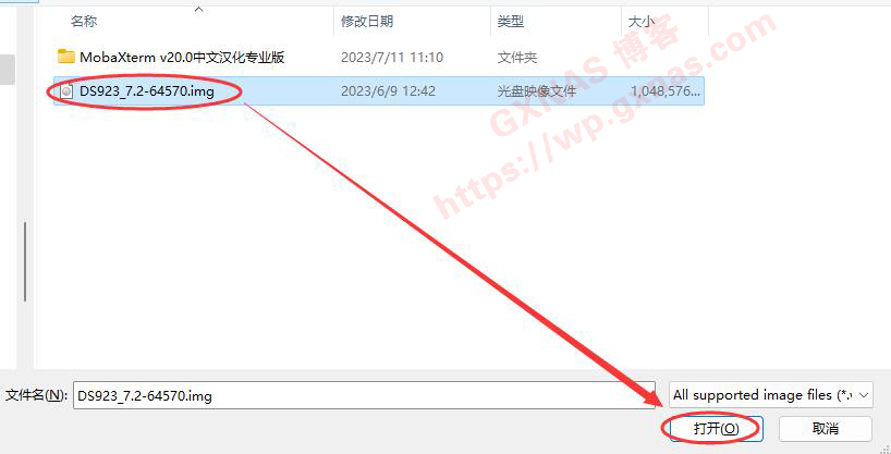 4、找到群晖的引导文件DS923_7.2-64570.img(本教程安装DS923+系统的7.2-64570版本,如果你想安装其他型号或者其他的版本,可以自行替换引导文件,文件名和路径不能有中文和特殊符号),打开;