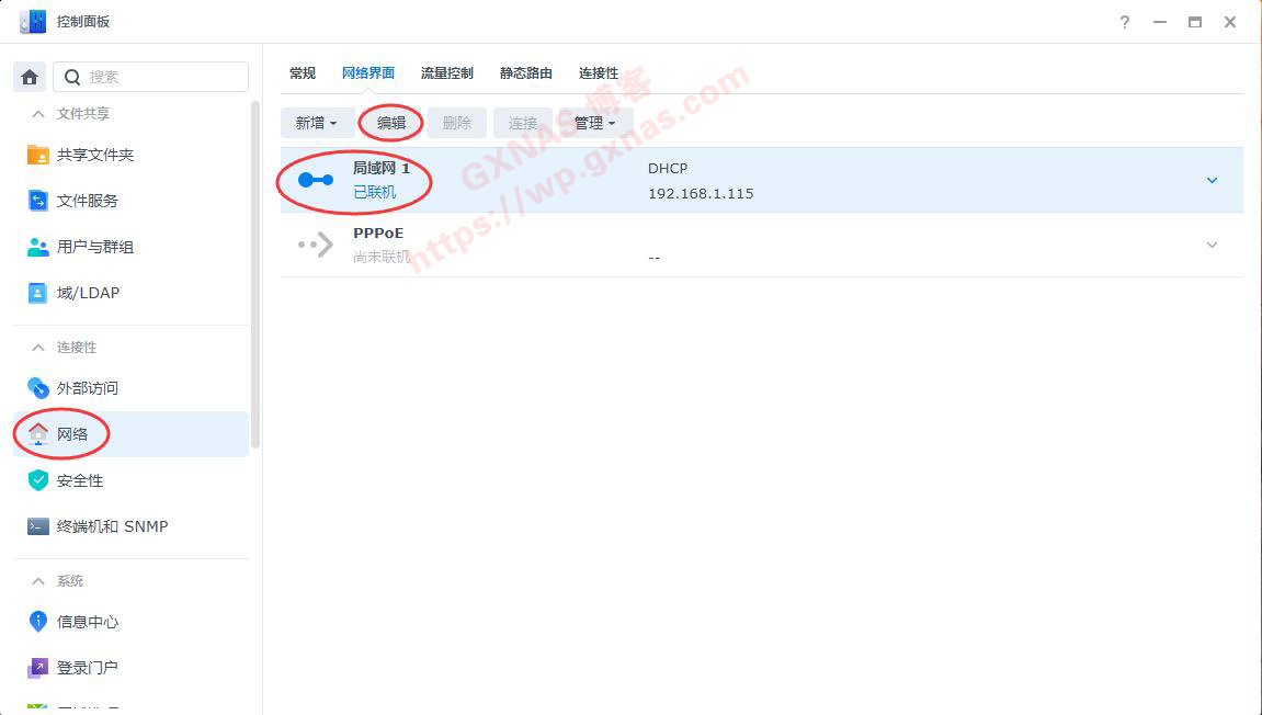 65、群晖控制面板,网络,网络界面,局域网1,编辑;