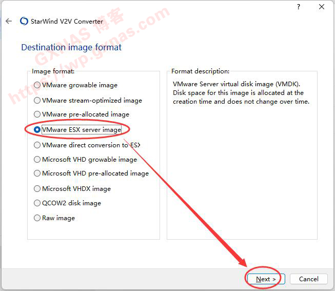 6、选择“Vmware ESX server image”,Next;