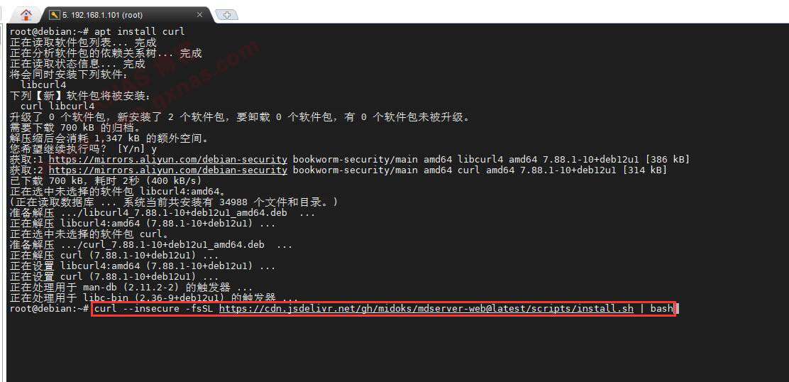 1、博主今天使用的是一台debian12版本的服务器来做测试,在Win电脑上使用MobaXterm用root账号登录到服务器SSH状态下,输入命令安装curl这个命令,需要输入y回车确认: