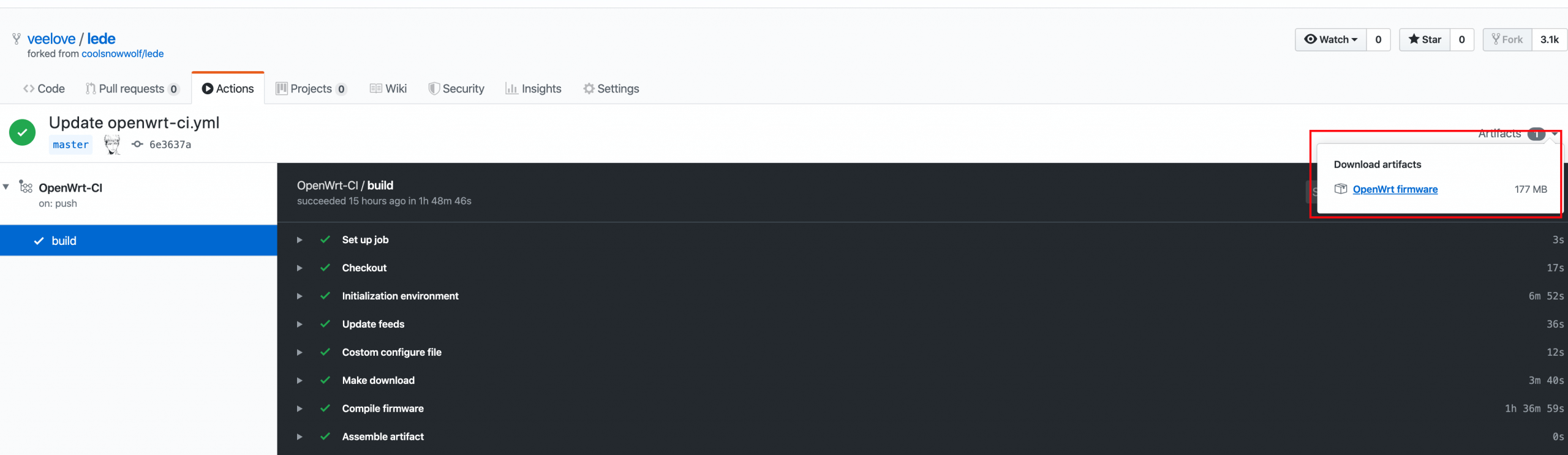 ## This is free software, lisence use MIT.# # Copyright (C) 2019 P3TERX# Copyright (C) 2019 KFERMercer# ##name: OpenWrt-CIon: push:branches: - master # schedule: # - cron: 0 20 * * * # release: # types: [published]jobs: build:runs-on: ubuntu-lateststeps: - name: Checkoutuses: actions/checkout@masterwith: ref: master - name: Initialization environmentenv: DEBIAN_FRONTEND: noninteractiverun: | docker rmi `docker images -q` echo "Deleting files, please wait ..." sudo rm -rf \ /usr/share/dotnet \ /etc/mysql \ /etc/php sudo -E apt-get -y purge \ azure-cli \ ghc* \ zulu* \ hhvm \ llvm* \ firefox \ google* \ dotnet* \ powershell \ openjdk* \ mysql* \ php* sudo -E apt-get update sudo -E apt-get -y install build-essential asciidoc binutils bzip2 gawk gettext git libncurses5-dev libz-dev patch unzip zlib1g-dev lib32gcc1 libc6-dev-i386 subversion flex uglifyjs git-core gcc-multilib p7zip p7zip-full msmtp libssl-dev texinfo libglib2.0-dev xmlto qemu-utils upx libelf-dev autoconf automake libtool autopoint device-tree-compiler sudo -E apt-get -y autoremove --purge sudo -E apt-get clean - name: Update feedsrun: | ./scripts/feeds update -a ./scripts/feeds install -a - name: Costom configure filerun: | rm -f ./.config* touch ./.config # # ========================固件定制部分======================== # # # 如果不对本区块做出任何编辑, 则生成默认配置固件. # # 以下为定制化固件选项和说明: # # # 有些插件/选项是默认开启的, 如果想要关闭, 请参照以下示例进行编写: # # ========================================= # | # 取消编译VMware镜像: | # | cat >> .config <> .config < > .config < > .config < > .config < > .config < > .config < > .config < > .config < > .config < > .config < 七、找到LEDE项目的ACTIONS,查看编译过程