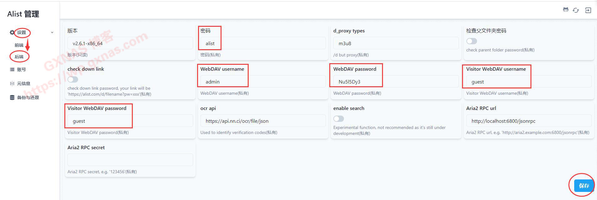 11、左边菜单“设置”,后端里面可以修改alist后台管理密码、WEBDAV的账号密码以及WEBDAV访客的账号密码,根据自己实际需求修改,改好了记得点一下右下角的“保存”才能生效;
