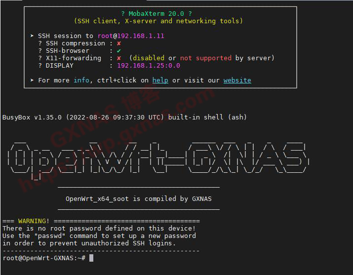 3、输入密码以后,就可以进入到OpenWrt的SSH状态下了;