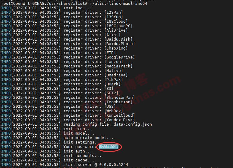 18、输入命令回车,运行一次alist,系统会随机生成后台管理密码,如下图的位置,复制出来,然后就可以把MobaXterm软件关掉了;