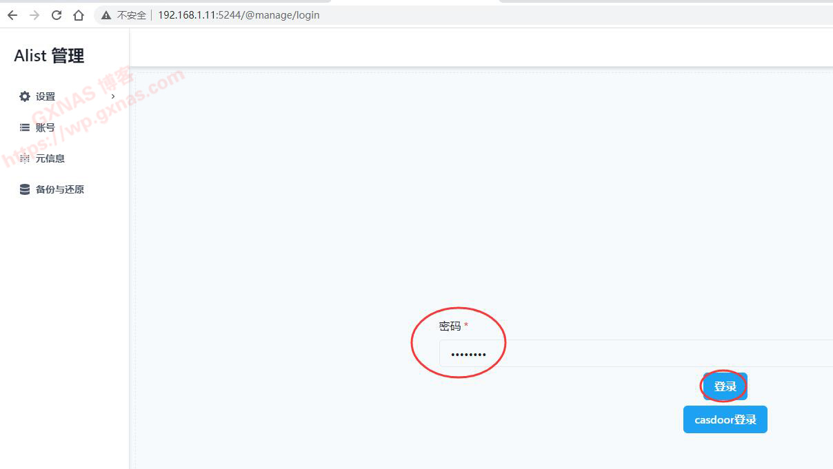 10、这里会弹出Alist后台管理的界面,输入初始密码alist,登录;