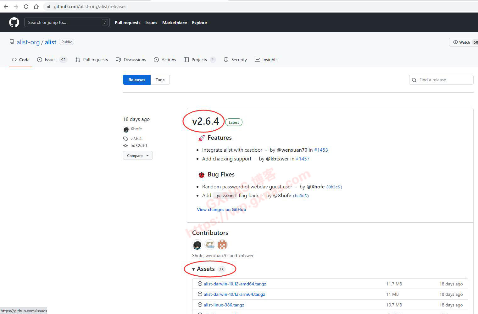 6、打开【Alist官方github网站】,截止2022年9月2日,Alist的最新版本是v2.6.4,在这个版本下提供有28个适用于不同系统的安装包下载;