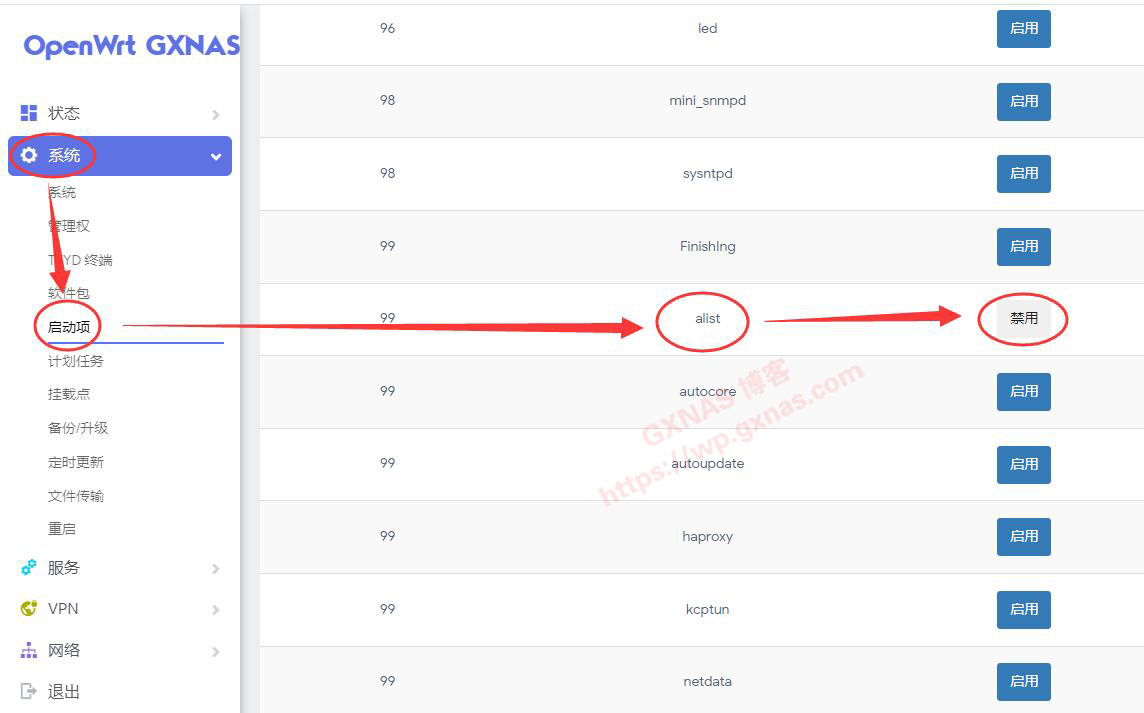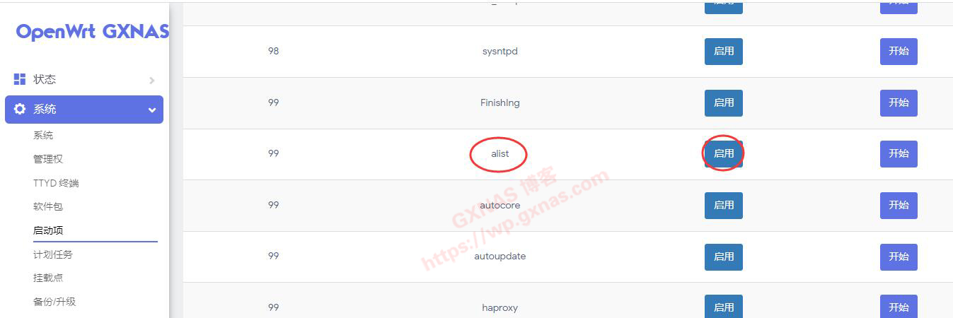 19、回到浏览器OpenWrt软路由的界面,在“系统”菜单“启动项”,找到alist,默认自动运行这里默认显示是“禁用”,点一下“禁用”这个按钮;